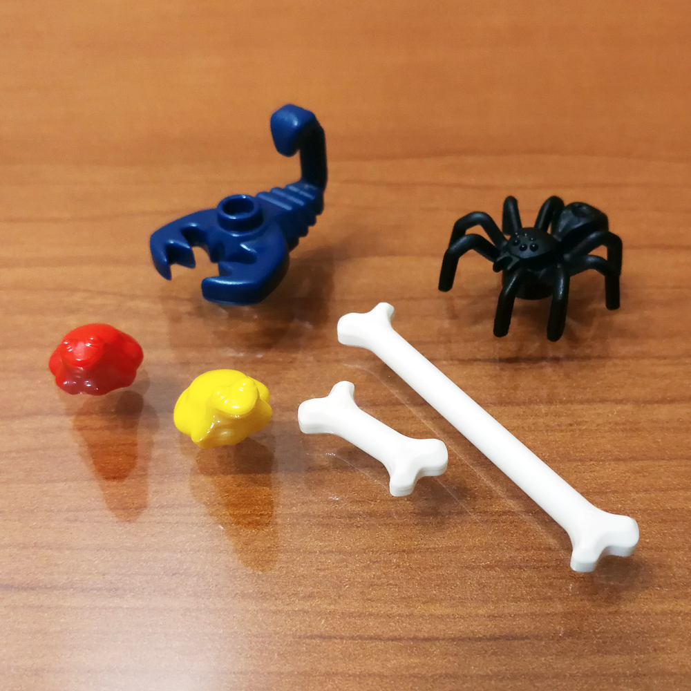Mix malých zvířátek, který obsahuje škorpiona, velkého pavouka, velkou a malou kost a 2 žáby.
