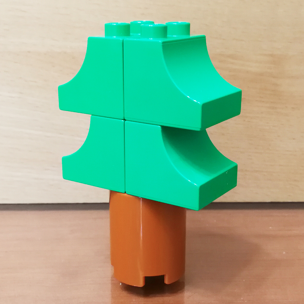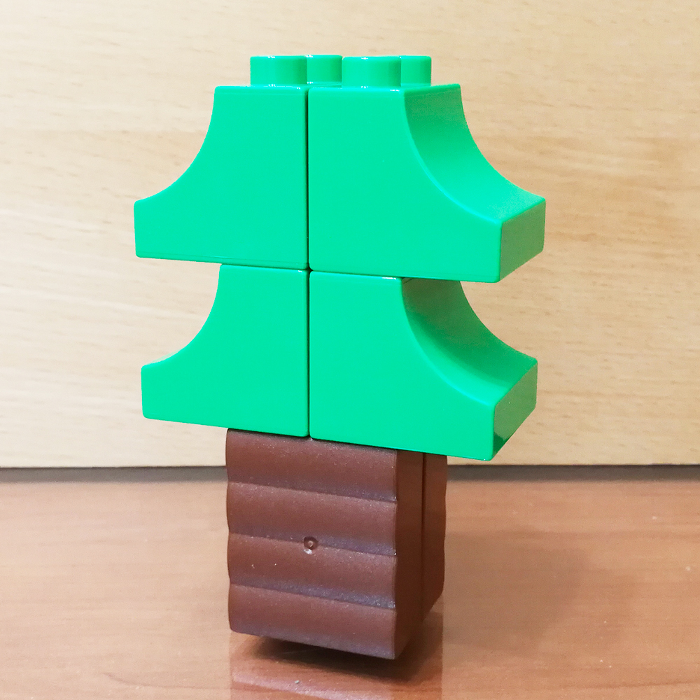 Stromeček složený z pěti (či šesti kostek) - s kulatým kmenem, a nebo kmenem z dvou vysokých dvojek s dekorem dřeva.