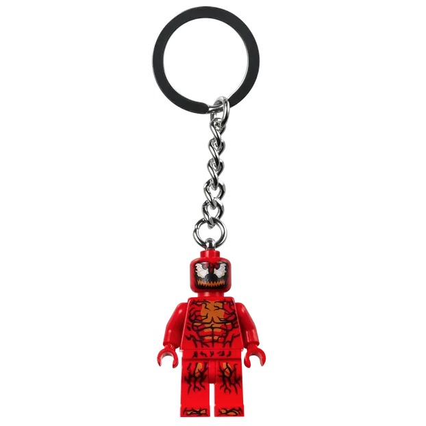 Přívěsek na klíče s minifigurkou LEGO® – Minifigurka Carnage s polohovatelnou hlavou a rukama je připevněna k pevnému kovovému řetízku s kroužkem. Minifigurku nelze z řetízku sundat