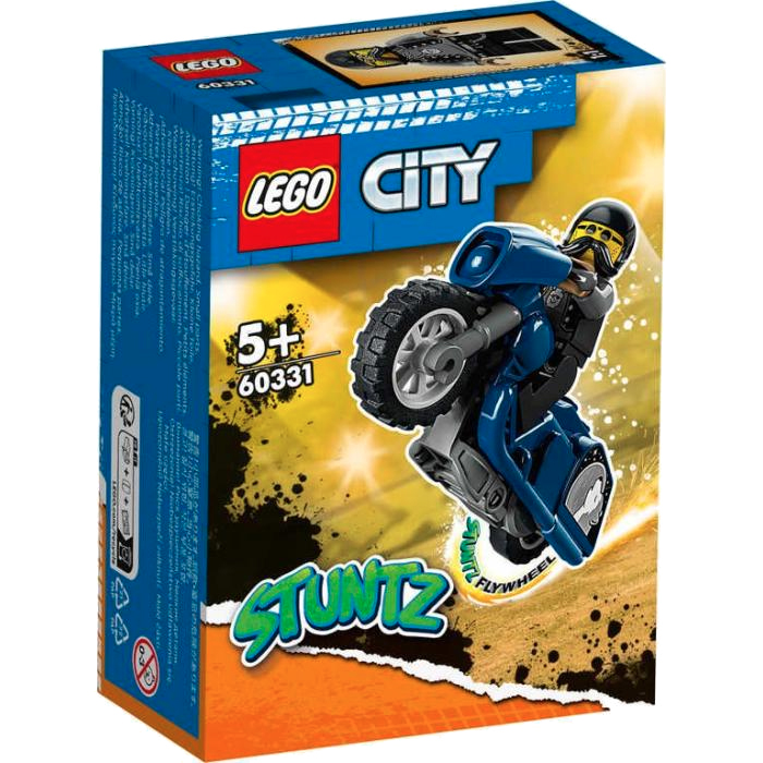 Co se ukrývá v krabici? – Vše, co budou děti potřebovat k sestavení kaskadérské motorky se setrvačníkem, a minifigurka Osamělého vlka z týmu LEGO® City Stuntz Skutečná kaskadérská akce – motorku stačí natáhnout, čímž děti aktivují setrvačník, a pak ji vyslat provádět úžasné kaskadérské kousky