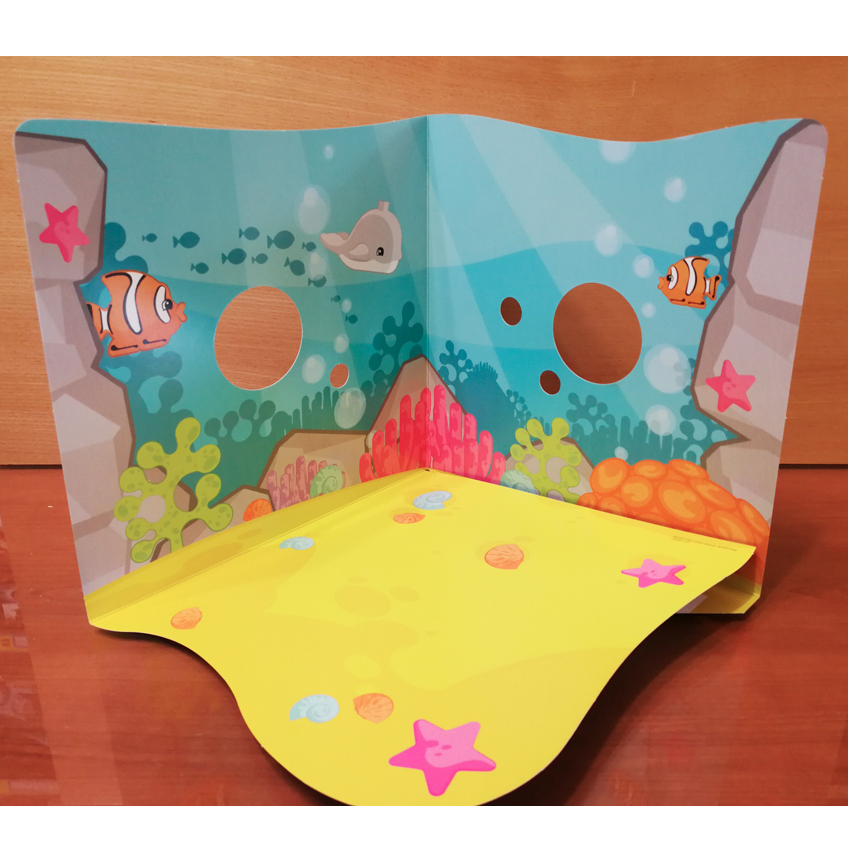 Papírové podmořské pozadí pro všechny dobrodružství pod vodní hladinou. Skrz díry mohou na scénu proplouvat karetky, rybičky či malá velryba (velká se do otvoru nevejde). Po hře je možné pozadí složit na plocho a uklidit.