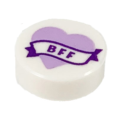 Plochá kulatá kostička 1x1 s potiskem fialového srdíčka s nápisem BFF.