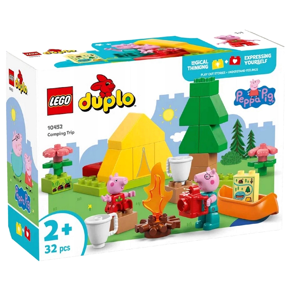 Malí stavitelé se vydají na dobrodružství s prasátkem Peppou se stavebnicí LEGO® DUPLO® (10452) Táboření. Malé děti můžou prostřednictvím kreativního hraní pozorovat, jak se cítí při zážitcích, které zažívají poprvé během hry na táboření s prasátkem Peppou a tatíkem, a pak usednou do kánoe a prozkoumají řeku.