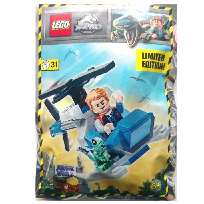Foilbag (pytlíčkový set) s Owenem, malým dinosaurem a helikoptérou z kostek.