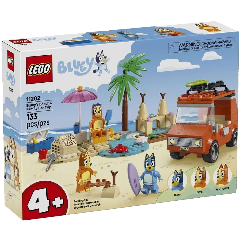 Tato stavebnice LEGO® obsahuje milované vozidlo z televizního seriálu Bluey se 2 surfovacími prkny připevněnými na střeše a kufrem na uložení chladicího boxu. Vyklápěcí střecha auta umožňuje dětem snadný přístup do interiéru, kde jsou sedadla pro minifigurky Bluey, Bingo a Chilli (maminky Bluey). Mezi plážové prvky, které inspirují děti ke kreativnímu hraní, patří působivý hrad z písku, ocas mořské panny z písku, do kterého se vejde minifigurka, lehátko, slunečník a palma. Nechybí krab, zmrzlina, sluneční brýle a opalovací krém.
