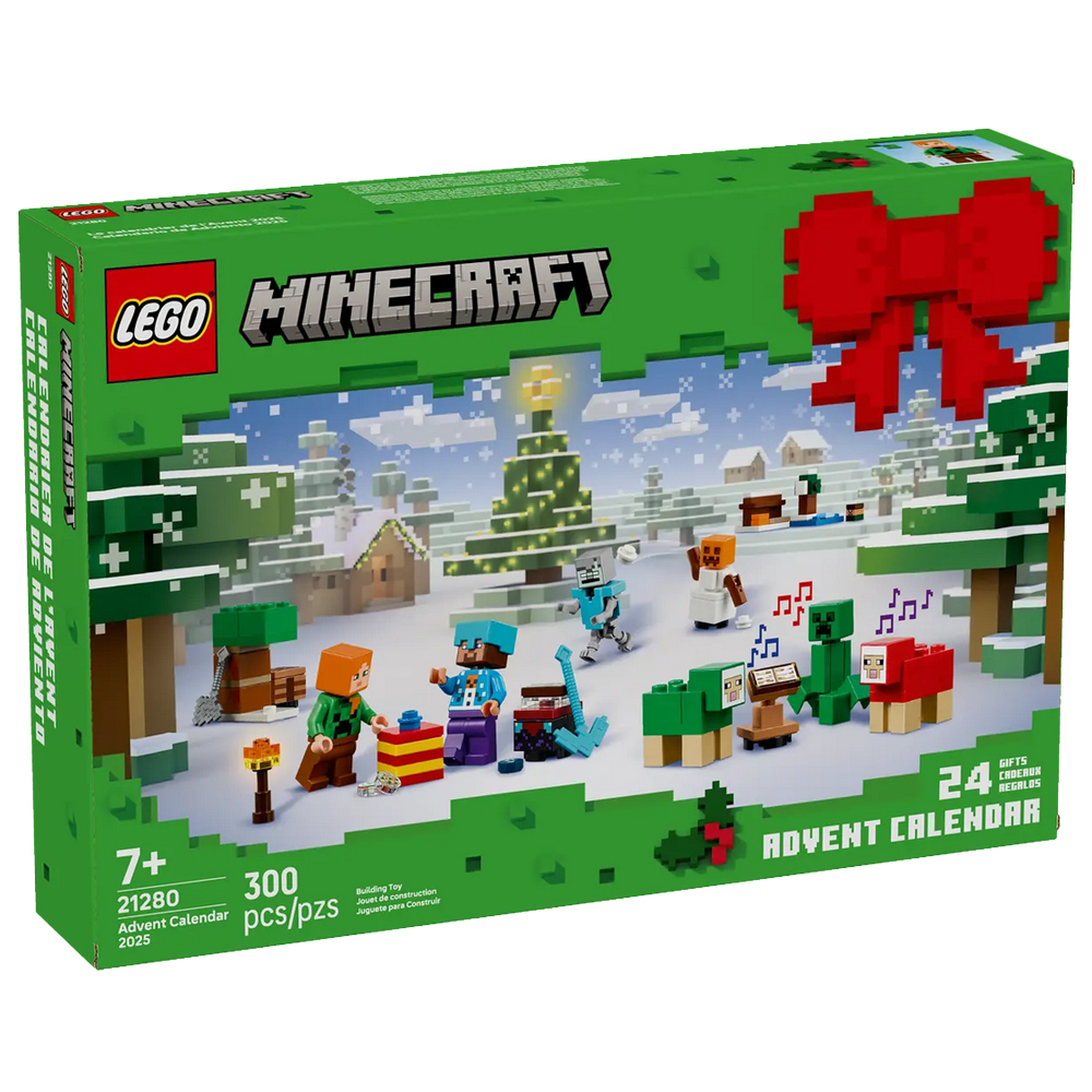 Za každým z 24 okének se skrývá jeden dáreček pro děti. Mezi minifigurkami najdete Alex ve svetru s motivem Creepera, Stevea ve svetru s motivem sněhuláka, diamantové helmě a s krumpáčem v ruce, Creepera u keře s bobulemi, utopence s trojzubcem, bludného kostlivce s diamantovou zbrojí, sněžného golema, zombie s očarovanou sekerou a vesničana Santu s pecí. Součástí je také spousta miniaturních modelů a parádních doplňků, které děti dobře znají ze své oblíbené hry.