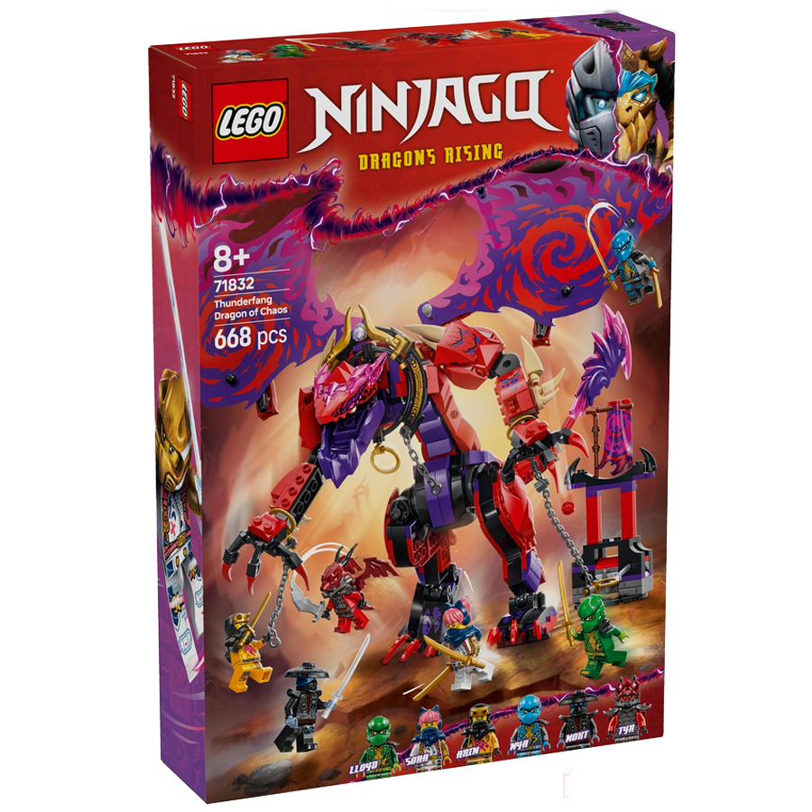 S nindžovskou stavebnicí LEGO® NINJAGO® (71832) Drak chaosu Thunderfang si kluci a holky od 8 let připomenou napínavé akční scény ze 3. řady televizního seriálu NINJAGO Dračí povstání. Tato stavebnice pro děti obsahuje velkého draka s pohyblivým ocasem, nohama, křídly, chodidly, hlavou a čelistí a vystřelovačem pod každým křídlem. Figurka draka je připoutaná k malému modelu a lze ji dostat na svobodu pomocí 2 prizmatických čepelí. Tato stavebnice LEGO obsahuje 6 minifigurek NINJAGO: Nindža válečníky Lloyda, Nyu, Arina a Soru, kteří mají nindžovské zbraně, a padouchy Nokta a vůdce dračích stvoření Tyra, kteří mají vlastní zbraně, aby si děti mohly zinscenovat napínavé bitvy dobra proti zlu.