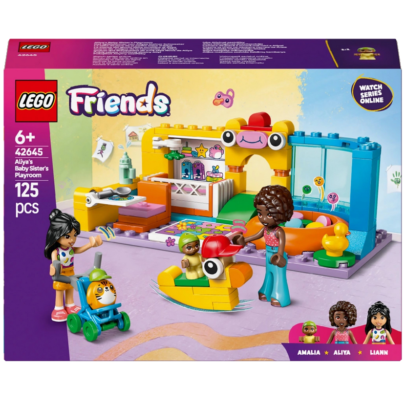 Inspirujte děti k tomu, aby postavily pokojíček, ve kterém se Aliya a Liann starají o Aliyinu malou sestřičku Amalii. Najdete tu všechno, co děti potřebují k vymýšlení příběhů o přátelství. Malou Amalii nakrmí u stolečku – díky chytré funkci převrácení uvidíte, jaký nepořádek takové miminko dokáže při jídle nadělat! Až bude čas na zdřímnutí, uložte Amalii do postýlky. Díky skluzavce, hrací podložce, bazénku s míčky, houpající se kačence a roztomilému plyšákovi ve stylu LEGO si miminko užije spoustu zábavy. Kamarádky pak vezmou Amalii na procházku v kočárku.