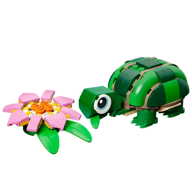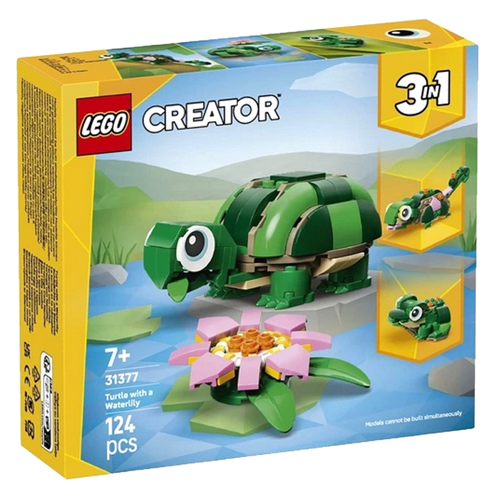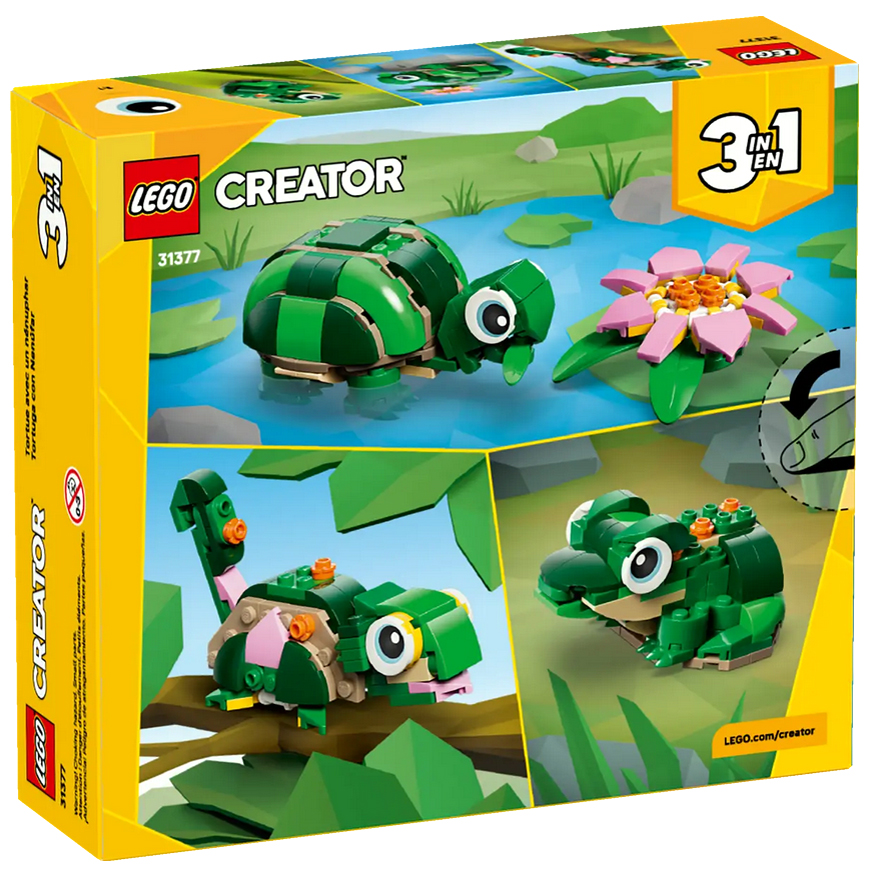 Stavebnice LEGO® Creator 3 v 1 Želva s leknínem (31377) umožňuje dětem od 7 let hrát si se zvířátky a vymýšlet kreativní příběhy. Tato roztomilá zvířecí hračka pro holky i kluky nabízí 3 různé možnosti stavění ze stejné sady kostek. Děti si mohou vybrat, jestli si postaví želvu s pohyblivou hlavou a tlamou a krásným růžovým leknínem, kterou pak lze přestavit na chameleona s pohyblivou hlavou a ocasem nebo na žábu s pohyblivou tlamou.