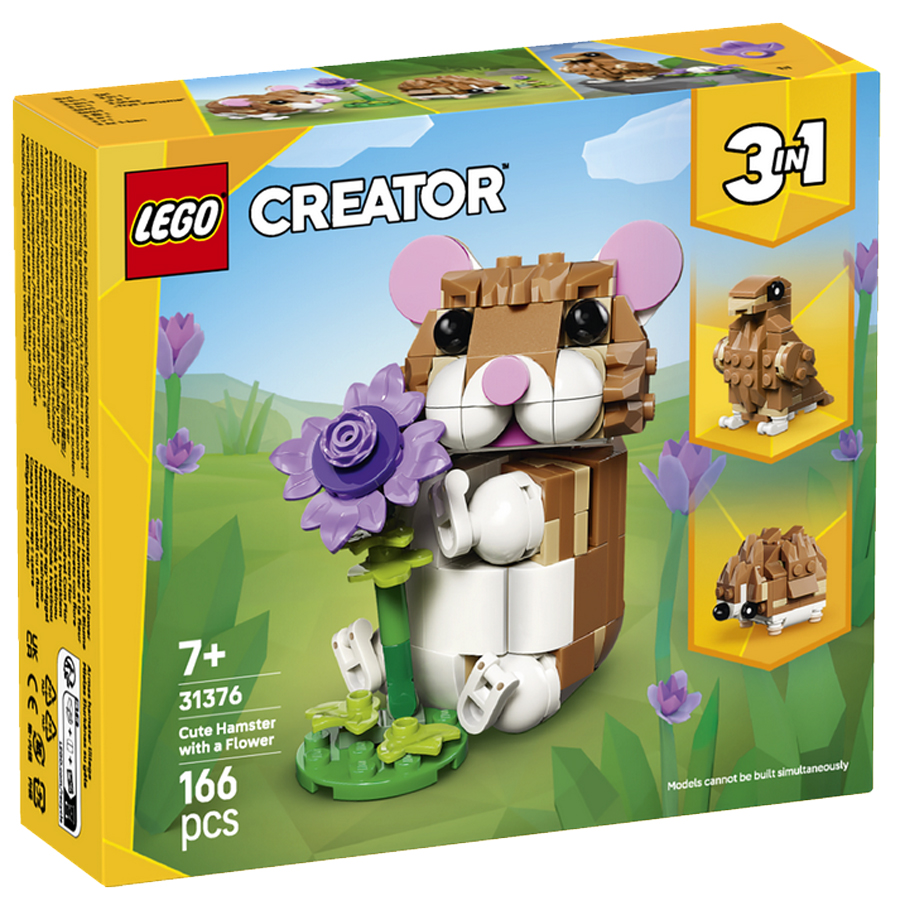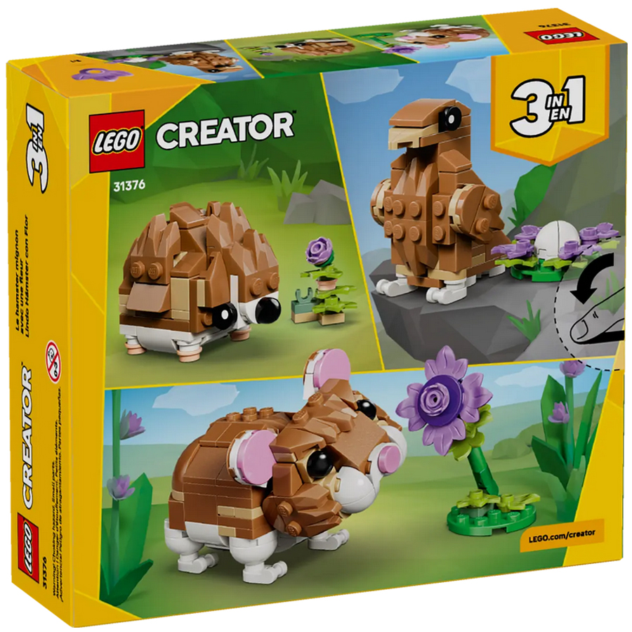 Holky a kluci od 7 let, kteří milují zvířata, si se stavebnicí LEGO® Creator 3 v 1 Roztomilý křeček s květinou (31376) užijí spoustu zábavy při hraní na zábavné příběhy. Tato rozkošná zvířecí stavebnice nabízí 3 různé možnosti sestavení ze stejné sady kostek. Děti si můžou postavit křečka s pohyblivou hlavou a předníma nohama a fialovou květinou. Model pak můžou přestavět na ježka s květinou nebo pohyblivého orla s vejcem v hnízdě.