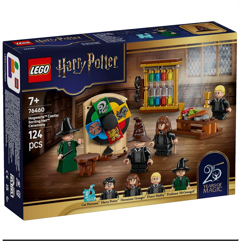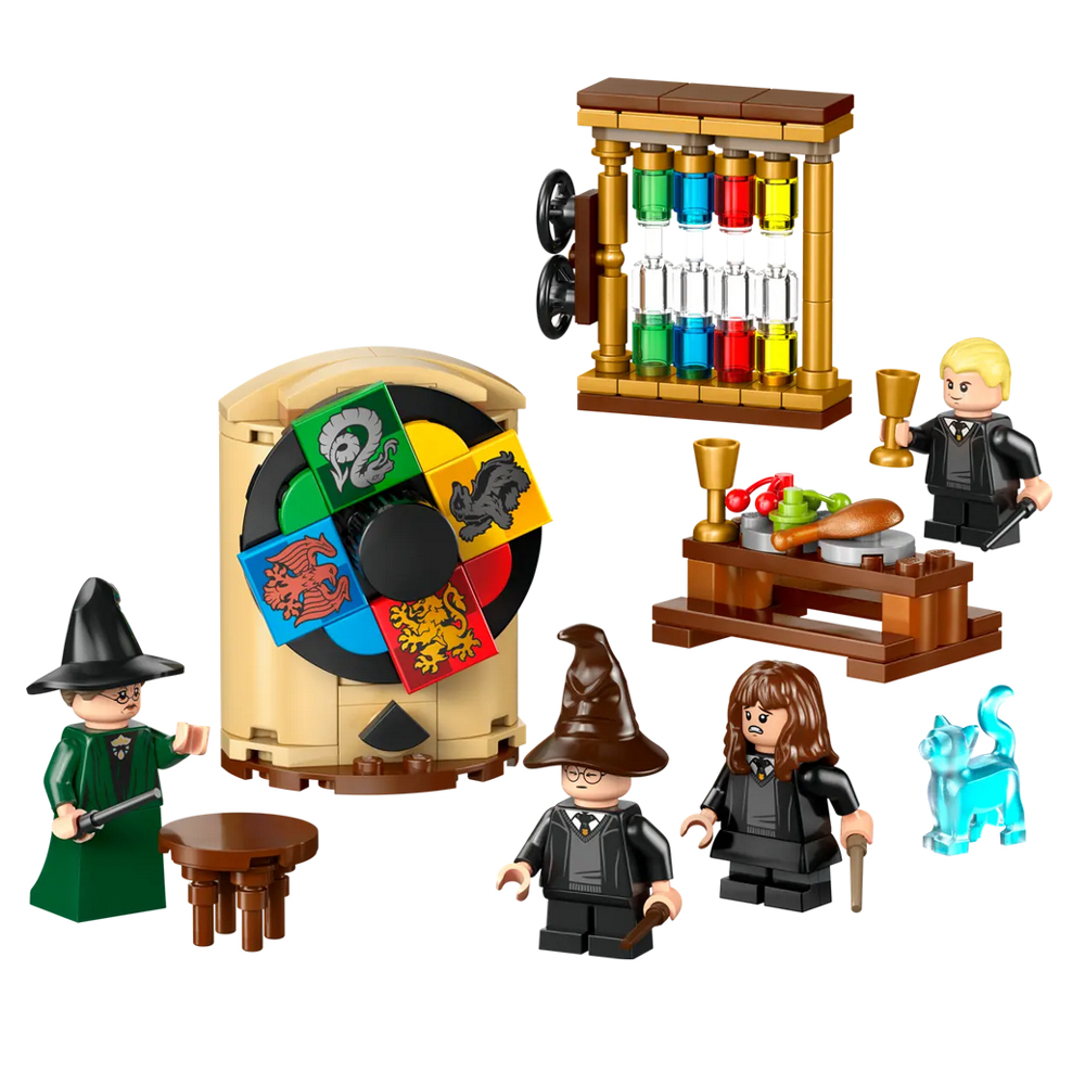 Nasaďte moudrý klobouk na hlavu jednotlivých studentů a otočte „třídicím kolečkem“, abyste zjistili, do které bradavické koleje budou zařazeni. Součástí stavebnice je také jídelní stůl a počitadlo bodů pro jednotlivé koleje pro ještě více herních možností. Tato dobrodružná stavebnice pro děti vzdává hold vůbec první stavebnici LEGO Harry Potter™ (4701), která vyšla v roce 2001, a obsahuje jednu z řady sběratelských patronů k 25. výročí: patrona v podobě kočky profesorky McGonagallové! Tato stavebnice se vejde dovnitř modelu Bradavický hrad: Velká síň (76435), další stavebnice z řady modulárních stavebnic LEGO Harry Potter (prodávají se samostatně), jejichž spojením vytvoříte ten největší Bradavický hrad z kostek LEGO vůbec.